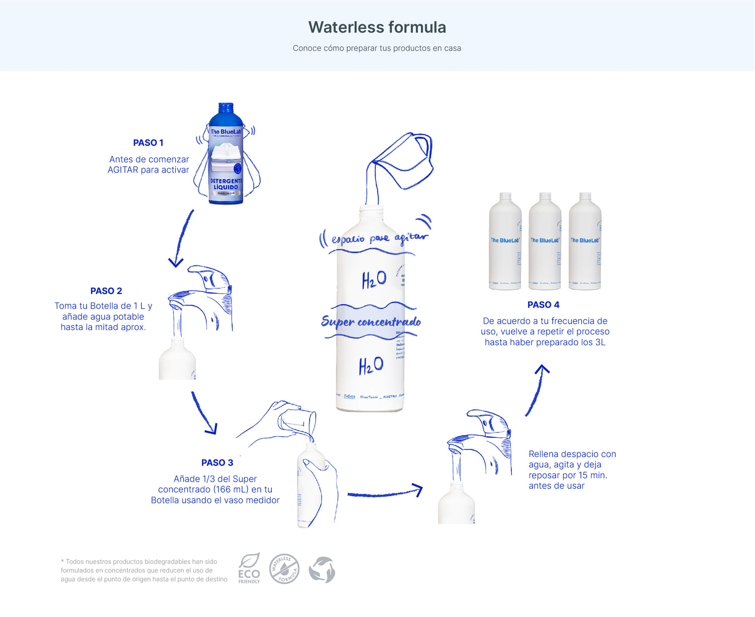 Detergente Líquido para diluir 500 mL + Botella Tapa Rosca Vaso Medidor Blue 1 L